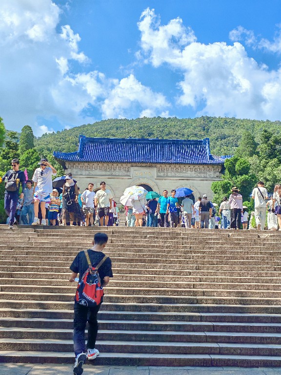 孙中山先生1868年出生,1925年逝世。如今逝世整整百年,但前来瞻仰的人潮从未间断。这说明人民没有忘记这位伟大的革命先行者,这才是唤醒民众的意义所在。中山陵巍峨雄伟,庄严壮观,整体犹如警钟,意在唤醒民众,与山势浑然一体,392级台阶。当年中国有3.92亿人,每一级都代表着一段艰难的历史。攀登过程中,我看到许多老人在家人的搀扶下艰难上行,孩子们则认真数着台阶数。民国15年即1926年动工,民国18年主体工程完成。同年6月1日,孙中山遗体从北京碧云寺迁葬中山陵,总设计师吕彦直。主体色调蓝白为主,经典永存。从正门而入,先生手书“博爱”横匾悬于檐下,不禁肃然起敬。